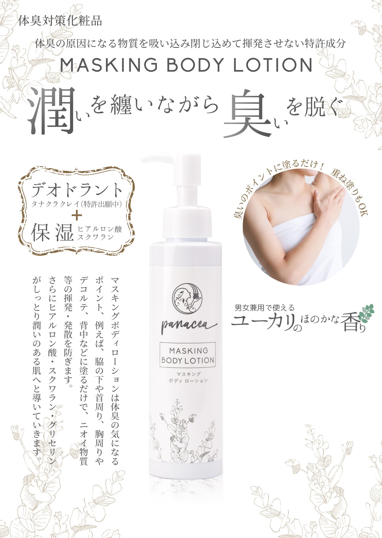 ヒアルロン酸、スクワラン配合でお肌を整えながらデオドラントを可能にしたローションです。